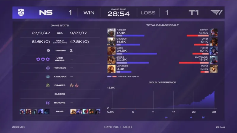 虎扑08月22日讯 【GAME2】NS蓝色方、T1红色方