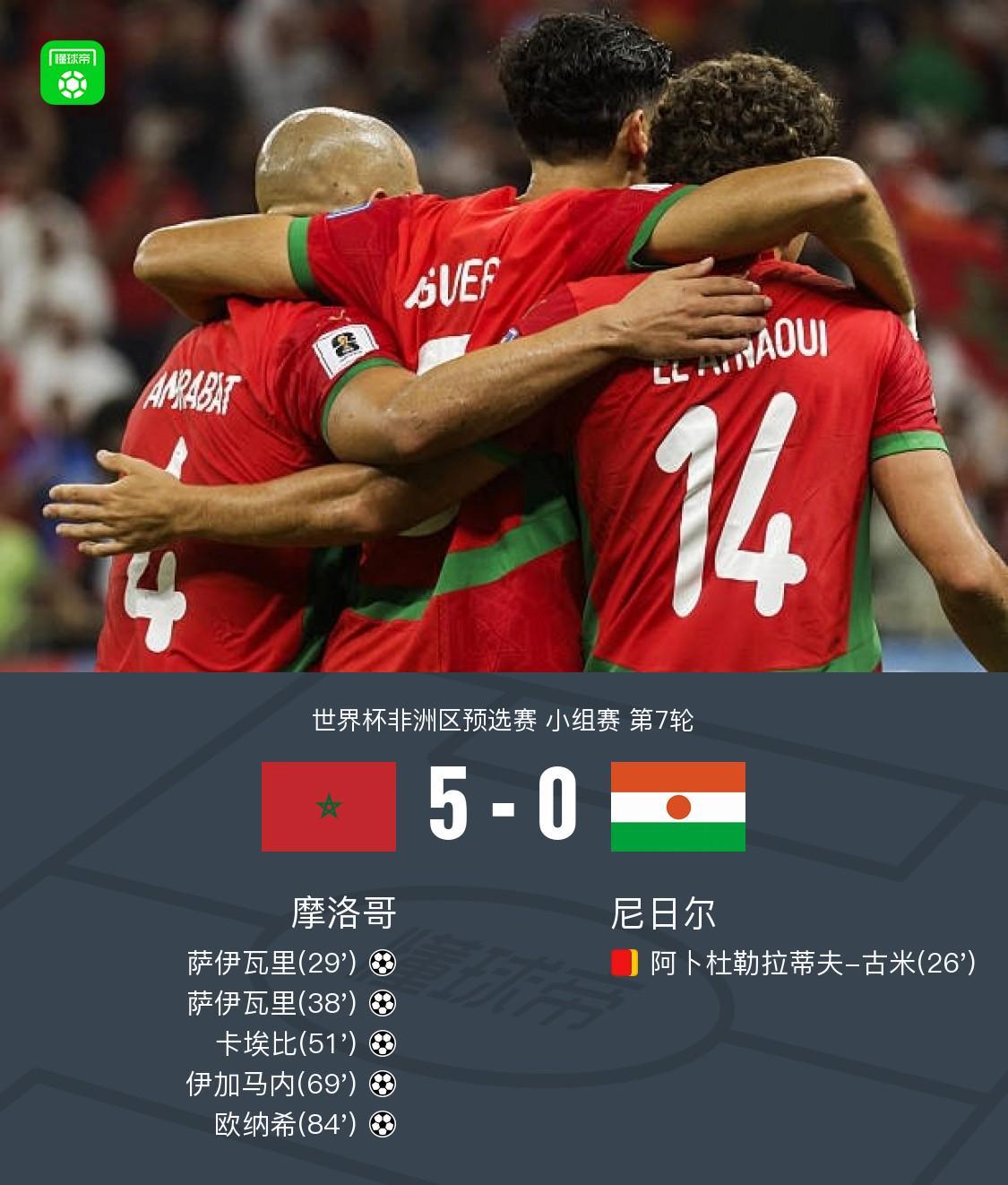 北京时间9月6日,世界杯非洲区预选赛小组赛第7轮,摩洛哥迎战尼日尔。比赛中,尼日尔球员阿卜杜勒拉蒂夫-古米在第26分钟因累计两张黄牌被罚下场,摩洛哥随后占据场上优势。 第29分钟,萨伊瓦里为摩洛哥首开纪录。第38分钟,萨伊瓦里再下一城,完成梅开二度。第51分钟,卡埃比接优素福-贝拉马里助攻破门得分。第69分钟,伊加马内由阿格尔德助攻建功。第84分钟,伊加马内送出助攻,欧纳希破门得手。 最终,摩洛哥以5比0的比分战胜对手晋级世界杯决赛圈。