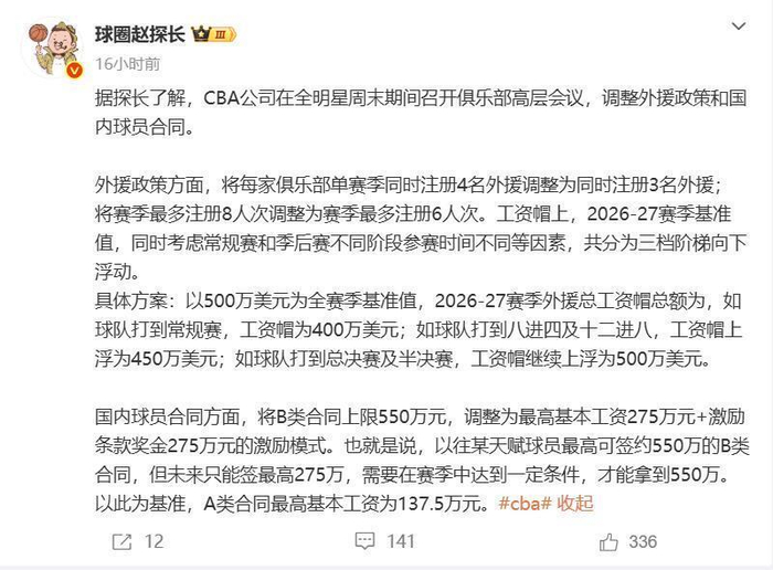 根据媒体人所讲,CBA公司在全明星赛期间召开高层会议,下赛季每支球队最多可以同时注册3名外援(本赛季为4名),下赛季外援注册人次调整为6人次(本赛季为8人次,上赛季没有限制);另外关于外援工资帽的问题,只打常规赛的球队外援工资帽是400万美元,打到季后赛12强或者8强的球队,外援工资帽是450万美元,半决赛(四强)的球队外援工资帽是500万美元。