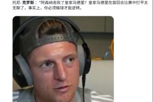 在欧冠1/4决赛首回合较量中,皇马0-3完败于阿森纳。随后有球迷号晒出一段克罗斯接受采访的视频,配文称克罗斯鼓励皇马次回合逆转,这条推文随后被国内外媒体搬运。